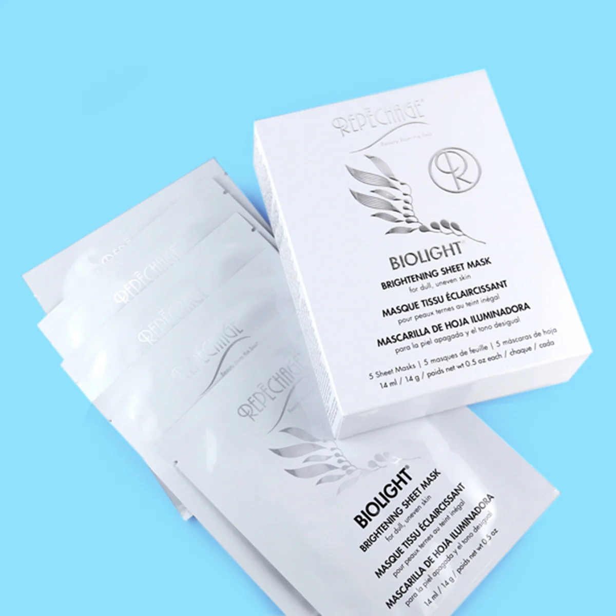 The Repêchage® Biolight® Brightening Sheet Mask goes beyond brightening, utilizing the latest biotechnology, including Alpha Arbutin and Diglucosyl Gallic Acid combined with exclusive Repêchage seaweed extracts. This easy-to-use sheet mask helps skin look brighter, more refreshed and ageless, lessening the appearance of uneven skin tone and dull sallow skin. Skin will look and feel smoother, with a more refined texture. Use once or twice a week to help brighten the appearance of the skin, restore moisture, before a special event, or in the morning before makeup. Always follow with Repêchage® Mineral Face Shield®.